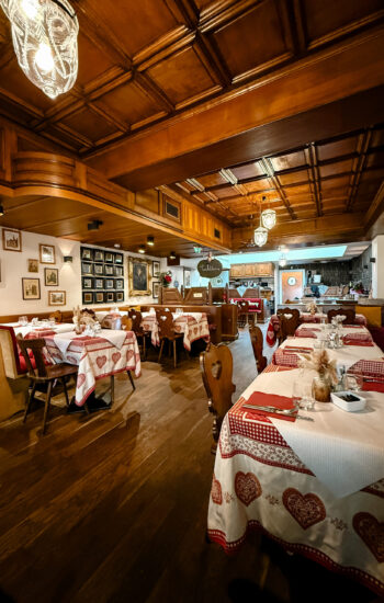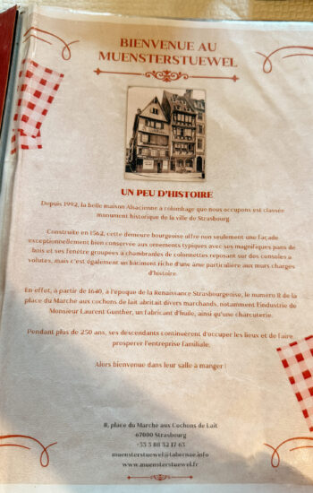 For lunch, we stopped at Muensterstuewel, a restaurant inside a half-timbered building from 1562 that has stayed in the same family since the 1600s. We ordered an authentic Alsatian meal — Spaetzle, Tarte Flambée, sausages, sauerkraut — and it was exactly what you want on a cold, rainy day.