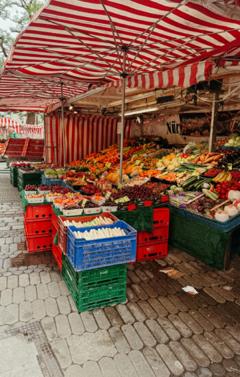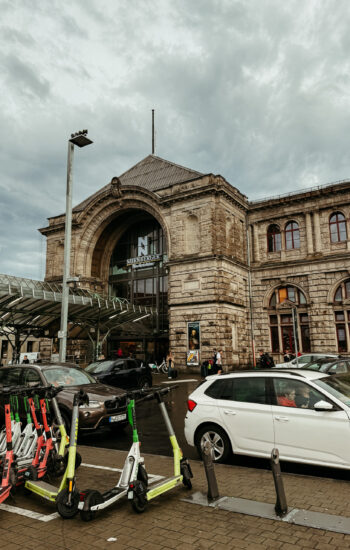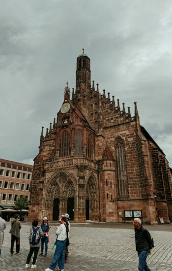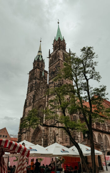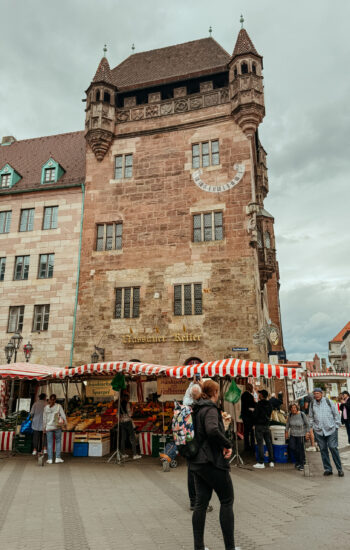 After the museum, we spent the afternoon exploring Old Town. We walked up to Nuremberg Castle, wandered through Weißgerbergasse (the prettiest, most colorful street), and browsed the stalls at Hauptmarkt, where you could actually smell how fresh the fruits and vegetables were. And because no trip is complete without at least one weather mishap, we got caught in the worst rainstorm of the entire trip — completely drenched from head to toe. We made a mad dash back to the hotel to shower and change before catching our train to Frankfurt.