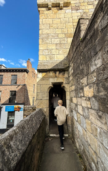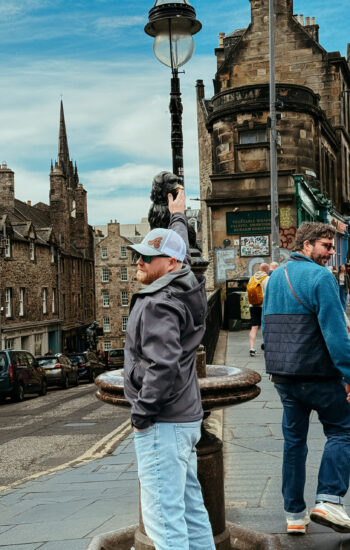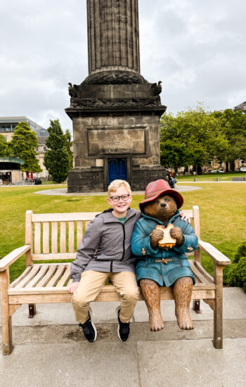 From there, we made the long (and I mean uphill) walk toward Edinburgh Castle, passing narrow cobblestone streets and bagpipers playing along the way. We stopped for dinner at The Royal Mile Tavern, where Joe tried haggis for the first time — and, surprisingly, liked it — while Kayden was thrilled to find a Paddington Bear bench in the park nearby. Before heading back to the hotel, we climbed the stairs up Calton Hill for an incredible view over the city. Even though the sun didn’t set until after 9:30 p.m., the evening light over the skyline was beautiful and completely worth the climb.